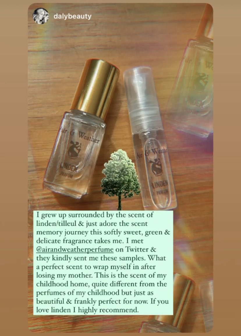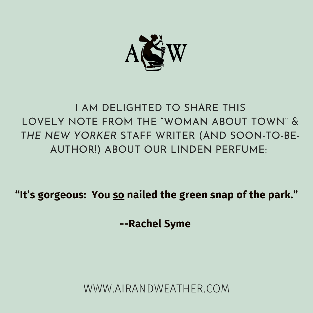 Air & Weather’s Linden is a serene, uplifting floral fragrance that captures the scent of real linden blossoms. Â It features top notes of warm neroli and linden with heart notes of honey and tuberose. Â And its base notes feature light woods and a balsamic resin. Â We’re honored to be included in Michael Edwards’ Fragrances of the World database, which describes this scent as a “warm, sophisticated white floral.”
